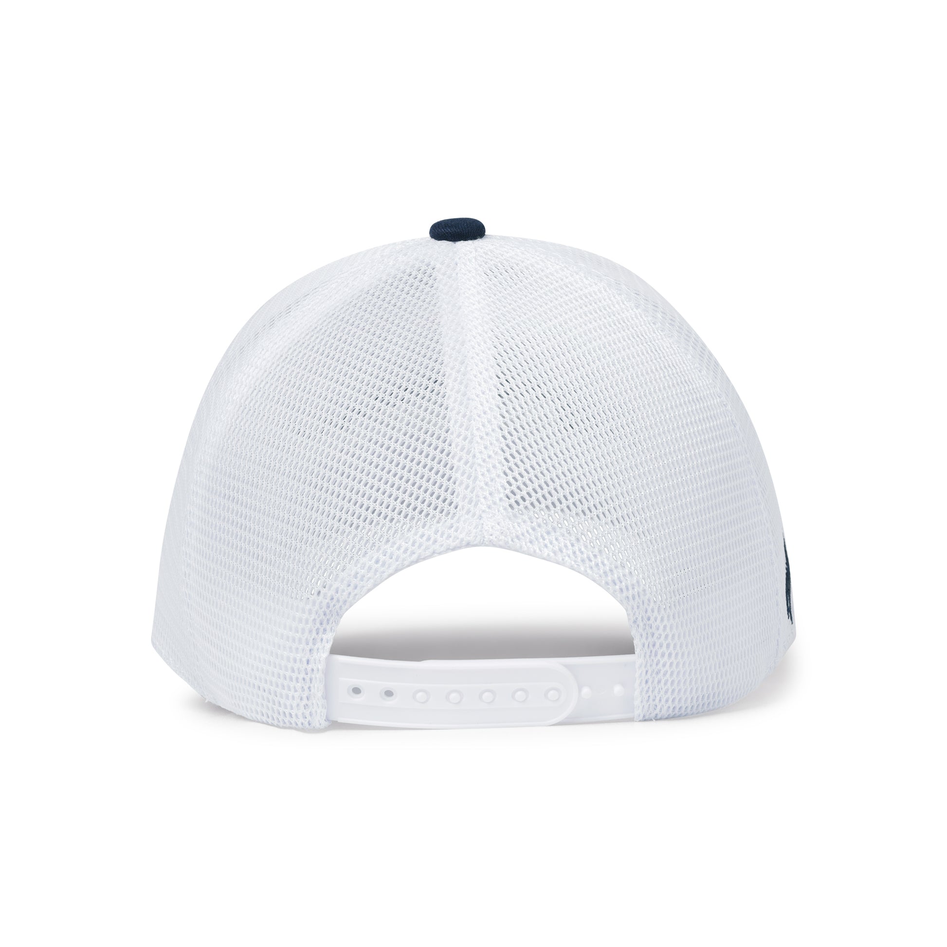 Structured front panels, navy embroidery and a breathable mesh back.