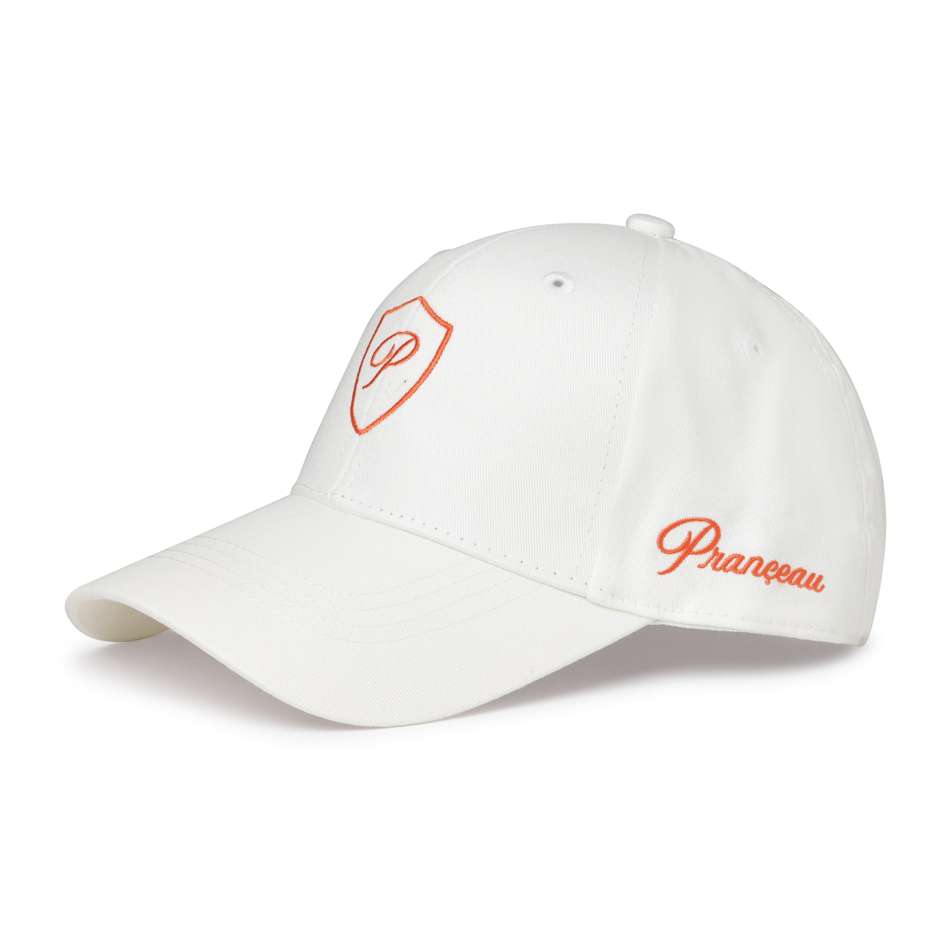 Classic white baseball cap featuring a subtle orange embroidered shield logo on the front. Designed with a curved brim and adjustable fit,